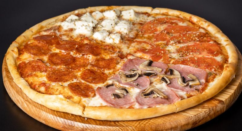 Брынза, помидоры, ветчина, грибы, пепперони, специи, моцарелла, фирменный томатный соус.