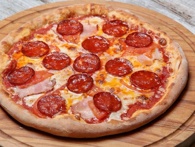 Фирменный томатный соус, пепперони, бекон, специи,нежнейщая моцарелла.